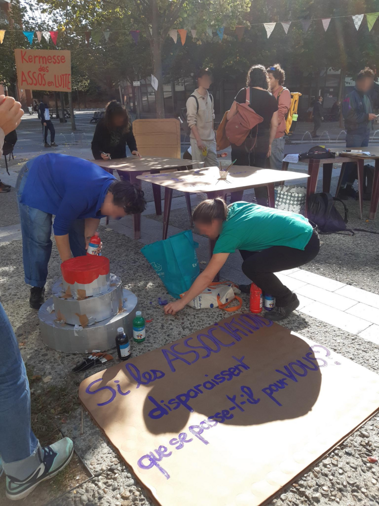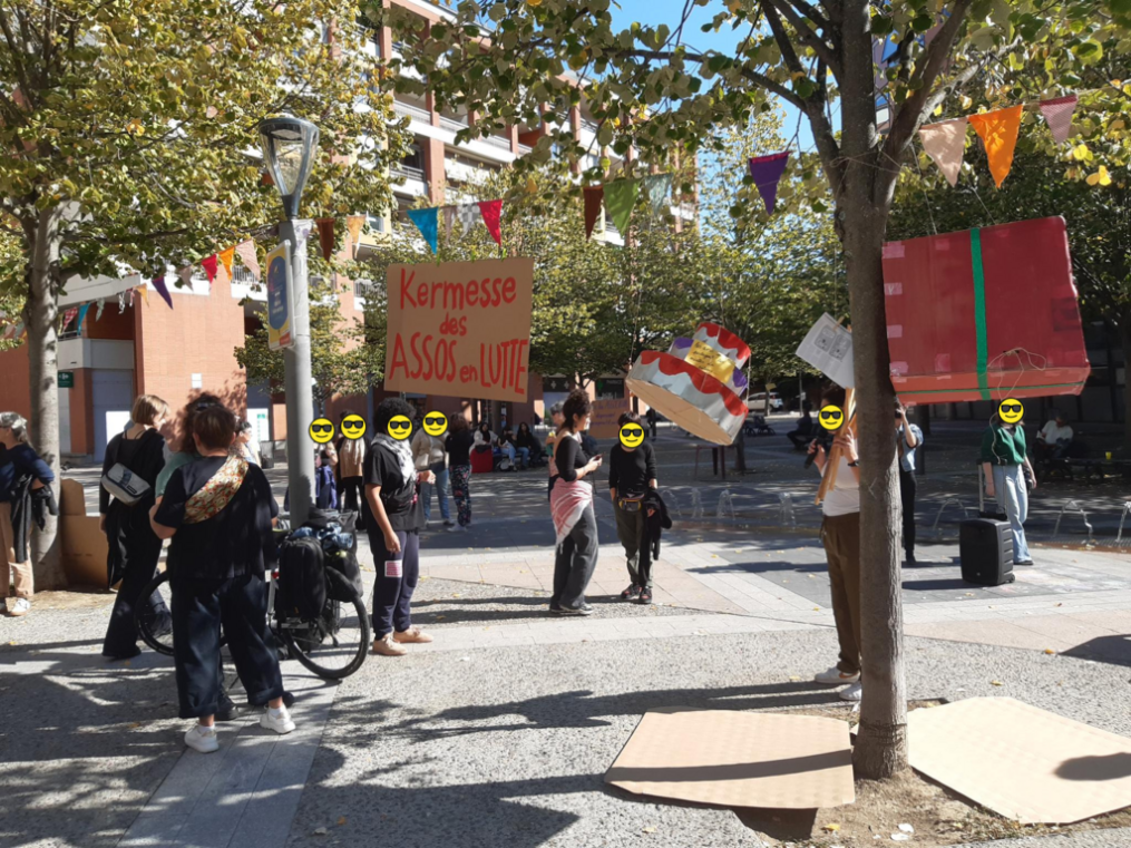Suite à la mobilisation massive du 10 septembre 2025, une AG des travailleur·euses du secteur associatif est appelé à se réunir le 18 septembre, prochaine date de grève annoncée. Lors de cette AG réunissant travailleur·euses syndiqué·es et non syndiqué·es, les dates des 11 octobre (journée de mobilisation appelé par le Mouvement Associatif) et 16 octobre (journée de grève appelée par le syndicat Asso-Solidaires) sont communiquées et permettent d’impulser une mobilisation spécifique du secteur associatif, au-delà des dates de septembre. L’idée d’une kermesse du secteur associatif pour le 16 octobre est lancée. Un groupe s’organise pour imaginer les animations et notamment la construction d’énormes pinatas. Un autre groupe organise des tours des asso dans les semaines qui suivent. Au total, 4 tours des associations ont lieu dans différents quartiers de Toulouse, 2 pinatas sont créées, un flyer maquetté et plusieurs réunions d’orga logistique permettent l’organisation de cette Kermesse revendicative!