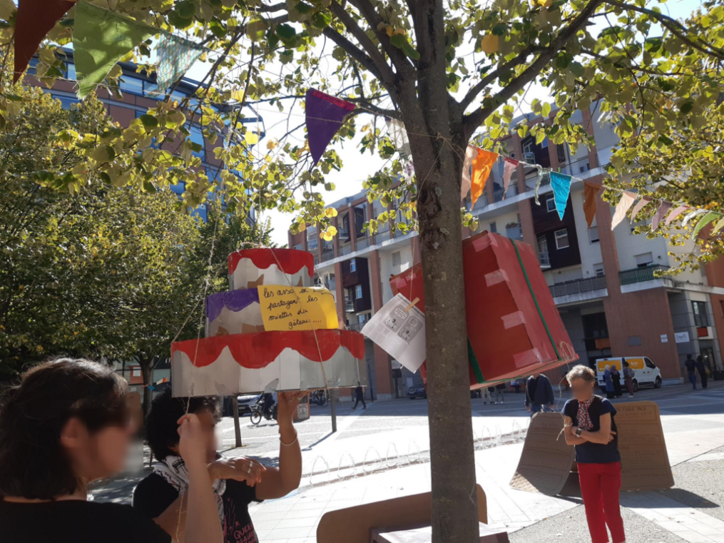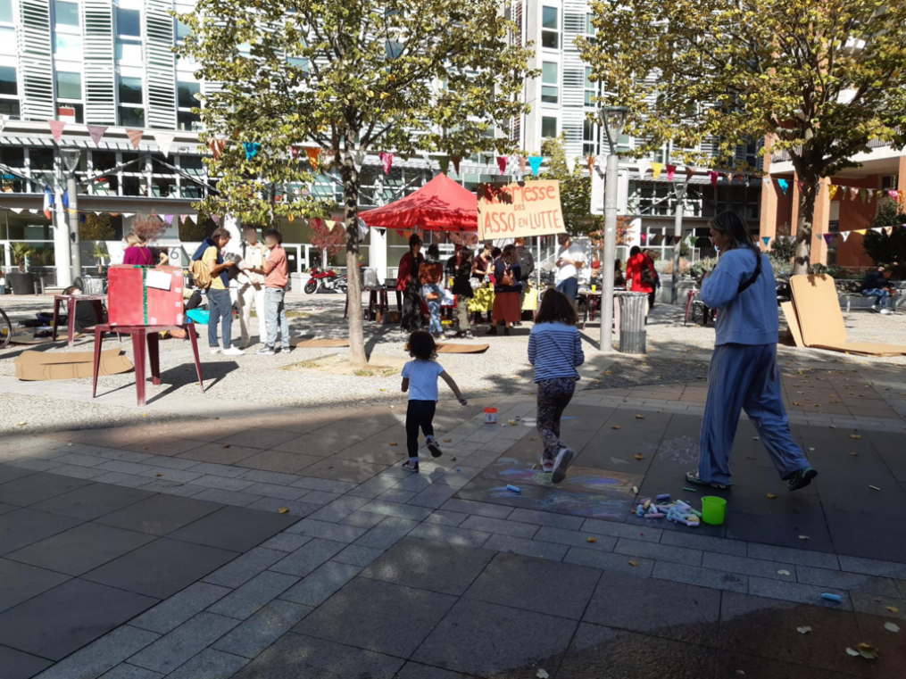 Nous nous sommes retrouvés à plusieurs militant·es grévistes pour une installation matinale de l’espace public : affichage d’un panneau “kermesse des asso”, montage de barnum, accrochage de guirlande de fanions, self-service de thé et café et mise en place des différents espaces de la kermesse. Il y avait une table d’accueil café, une zone de préparation de sandwichs, une table d’info du syndicat Asso-Solidaires, un endroit pour créer les grands panneaux en cartons avec une trame commune pour visibiliser la situation de chaque association et les afficher, un porteur de paroles sur « si les assos disparaissaient, quel impact sur ma vie? », etc. L’animation de ces différents espaces a permis rencontre et discussion. Il y a eu du passage, plein d’échanges avec des passant·es comme des salarié·es du secteur associatif venu·es discuter. Les sandwichs et crêpes confectionnés ont régalé passant·es, grévistes et collègues venu·es se joindre à la kermesse sur la pause déjeuner.